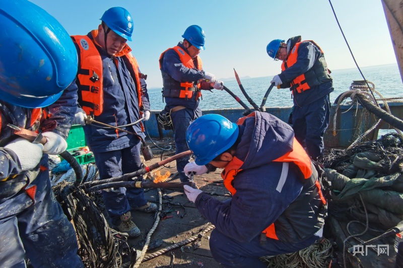 海缆班工作人员正在进行石海线海缆抢修作业(央广网见习记者 王松 摄)
